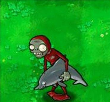 (1)海豚僵尸骑海豚突破池塘防线的弱点。骑着海豚的僵尸僵尸其实是撑杆跳僵尸的水下版本,生命力中等。它骑海豚时移动很快,不骑时移动很慢。特技是从水中左侧第八列跳过第一个障碍,除了高高的坚果墙和纠结的海藻。跳过第一道障碍后,海豚消失并减速。