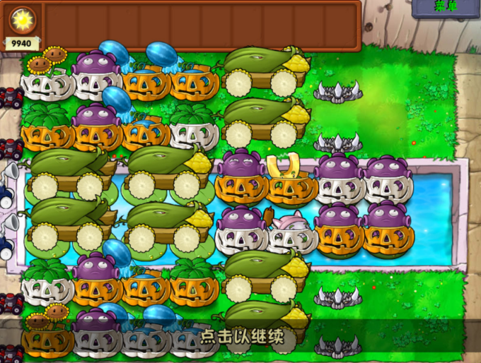 5.第三级:继续存钱,拿两个南瓜头,保护地上的一切。游泳池后面四个方块不需要保护,因为敌人走不了那么远。用升级的蘑菇种植地面荆棘后面的四个空方块。升级第1排和第6排的冰西瓜。