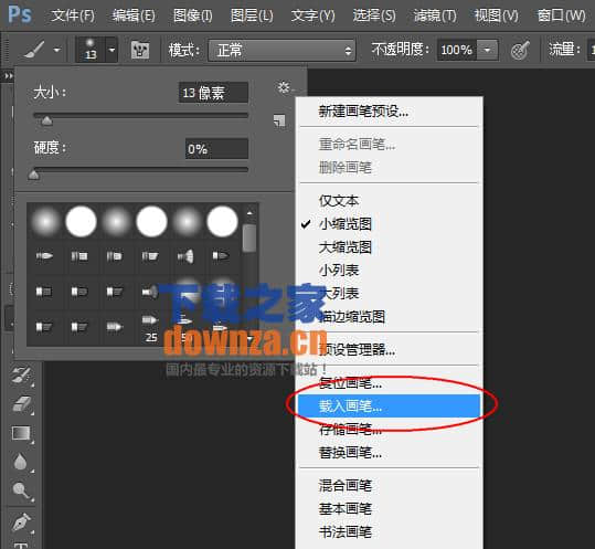 3、在这个下拉框的右上角,有一个小箭头,点击它,并在出来的菜单中选择“载入画笔”。击“载入画笔”后,会弹出来一个对话框,找到你的画笔文件位置,笔刷文件格式为.abr的文件