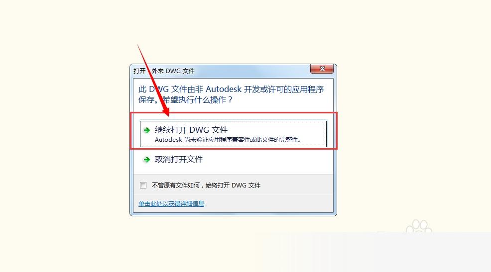 双击转换后的CAD文件,Auto CAD会弹出一个对话框提示:Open-foreign DWG file。选择“继续打开DWG文件”以打开该文件。