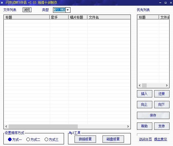 闪存式mp3伴侣是一款mp3歌曲排序软件。这个软件制作的时候是为MP3播放器设计的,也支持u盘和闪存盘的MP3排序。现在MP3播放器用的比较少,但是可以用来对存储卡、u盘或者移动硬盘里的MP3歌曲进行排序。