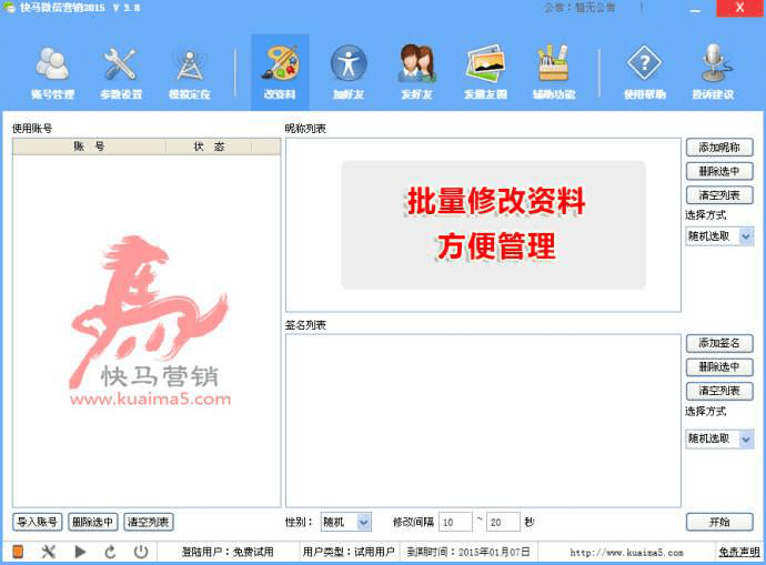 快马微信营销软件免费版是基于微信定位功能开发的营销软件。快马微信营销软件可以帮助用户快速建立庞大而精准的客户数据库,并让你快速将产品信息发送给有需求的客户。同时软件可以永远免费试用,没有时间限制。必要时下载。