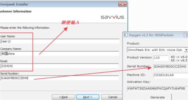 6.让我们回到Omnipeek安装界面,只需填写序列号上方的内容,序列号栏中的注册机中的序列号如图所示;