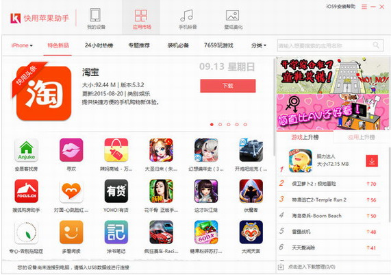 快用苹果助手是一款非常好用的苹果设备辅助管理工具。快用苹果助手为用户提供了丰富的软件和游戏资源,这些都是正版授权。你可以正常使用它们而不用越狱。你只需要选择软件,点击下载,这个工具的其余部分将为你处理一切。