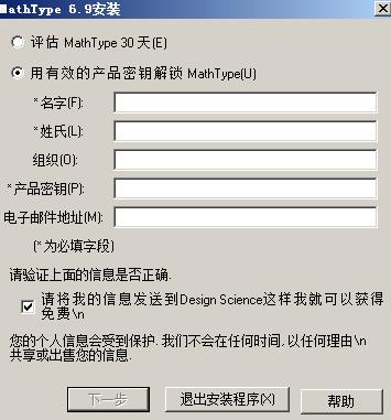 注意:只有MathType的正版用户才有产品密钥,评估试用版只能免费享受30天。3试用期结束后,MathType将运行缩减模式。