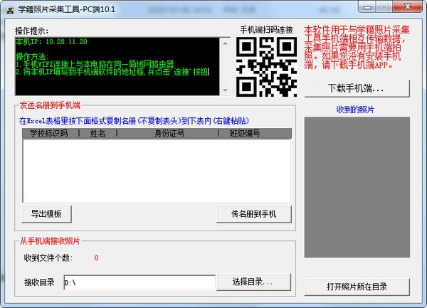学籍照片采集工具(学籍照片采集软件)是一款绿色便捷的利用手机和电脑拍照和自动命名的工具。在工作中经常遇到要给许多人拍照的情况,拍照完毕后还要对照片的名字进行命名,费时费力不说,稍不留心还会弄错。随着智能手机技术的不断进步,如今,手机拍照质量也得到了大幅提升。本软件就是充分地利用了手机拍照的功能,方便快捷地进行拍照和命名。照片的命名规则有多种方式可供选择,用户可以根据需要自己设定。拍照前,只需将制作好拍照的名册通过手机端程序导入手机中或通数据线传入手机中,按照名册依次拍照,拍照完毕后自动按照名册数据给照版命名,并且可以通过本软件配套的电脑端程序通过WIFI将照片传到电脑上。 软件使用简单,方便快捷,占用空间少,是您理想的选择。