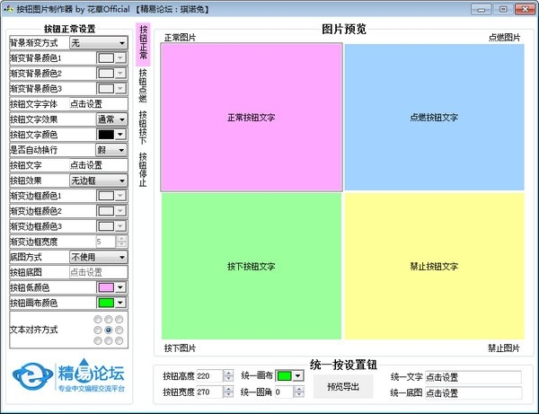 按钮图片制作器是一款图形按钮底图图片制作器,支持多种选择,多种方式,效果预览,支持正常图片、点燃图片、按下图片、禁止图片四种按钮图片制作!