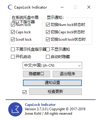 CapsLock Indicator是一个免费开源的小工具,它可以将上述按键的激活状态反应在桌面上,这对于那些连接了没有指示灯的键盘的电脑很有用。