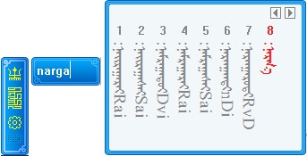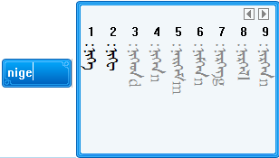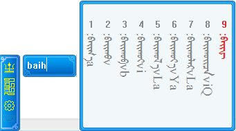 输入字母后候选框中显示的黑体词是和输入码所匹配的蒙古文词,而灰色词是部分匹配词。用户可依据灰色词下面的输入码提示继续输入,最多显示随后的三个字母,其中大写字母是下一个音节首字母,用户可直接输入大写字母快速录入下一个音节,例如用户要继续录入yabvba时,在ybv基上直接输b,即可。