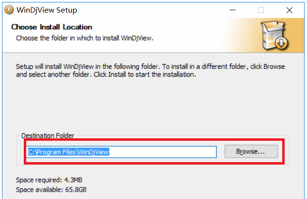 3、为djvu阅读器选择安装位置(choose install location),你可以点击“bwse”【浏览】自定义一个安装路径,因为阅读器默认是安装在C盘的,小编不建议大家选择默认安装哦。