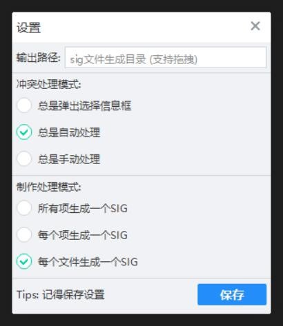 输出目录: 默认sig文件生成目录是在 程序运行目录sig_out 文件夹下
