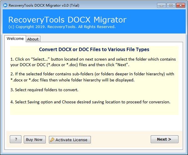 RecoveryTools DOCX Migrator版允许将Word文档转换为20多种有用的文件,文本和Doc格式