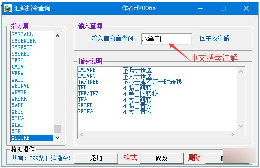 汇编指令查询软件是一款实用的编程辅助软件,汇集了众多的指令集可以查询,输入首拼音开始查询,支持中文搜索注解!