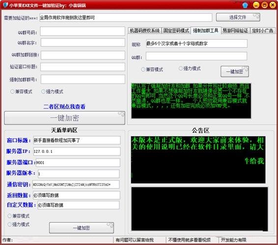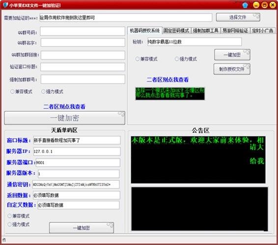 小苹果EXE文件一键加验证版是一款功能齐全强大的EXE文件验证工具,小苹果EXE文件一键加验证版可以无视加壳,能够帮助用户非常轻松地一键添加网络验证,小苹果EXE文件一键加验证软件支持端口IP设置、支持多种加密模式的选择、支持QQ群导入的设置,能够基本满足用户的程序加密需求。