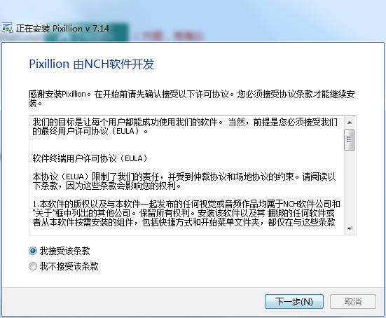 1、在下载资源库下载NCH Pixillion图像照片格式转换软件最新版压缩包,进行解压,解压之后得到EXE程序,双击打开,阅读“授权协议”。如果你接受协议中的条款,单击我接受继续安装。如果你选定取消,安装程序将会关闭。必须接受协议才能安装。