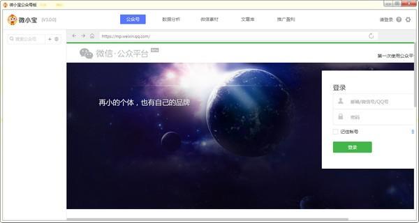 微小宝公众号版版是一款优秀的微信公众号管理软件,微小宝公众号版版是一款为微信公众号的用户打造的一款软件,微小宝公众号版版拥有数据分析、微信素材、文章库、推广盈利等模块,软件的开发和团队来自国内一流的互联网公司,软件支持所有公众号的定时群发功能,软件有多公众号管理功能。