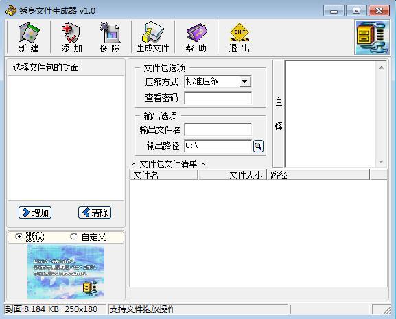 绣身文件生成器正式版是一款非常好用、便捷的专业化压缩软件,绣身文件生成器正式版可以简单的把文件包添加到图片文件中去,图片文件可以正常打开,将图片文件的扩展名改成ZIP文件后,文件就可以用WINZIP或WINRAR程序打开,绣身文件生成器版将显示的网络图片下载到本地后改成ZIP文件可以用压缩软件打开其中的隐藏内容。