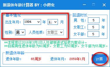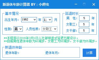 新退休年龄计算器电脑版是一款用于计算退休年龄的应用工具,新退休年龄计算器版用户只需要输入基本情况即可快速计算,新退休年龄计算器界面小巧、作简单,特别适合用户使用,该软件以2016年3月1号人社部渐进式延修方案设计,目前男退休年龄60周岁、女50周岁、女55周岁!