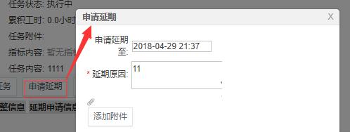 申请延期,这个功能只有执行人是自己的时候才能申请。写个延期原因后提交即可。