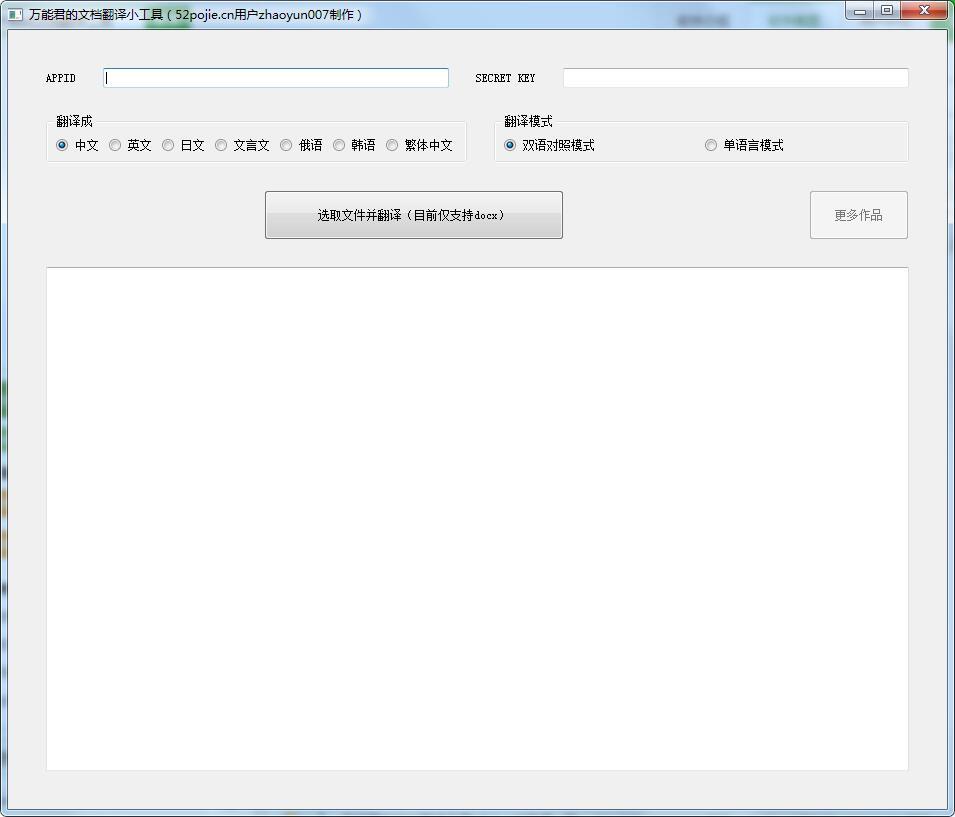 软件也是基于免费的百度翻译接口,就是要自己申请哈,完全免费。支持翻译成中文、英语、汉语、文言文、俄语、韩语、繁体中文等,其实还可以添加很多。