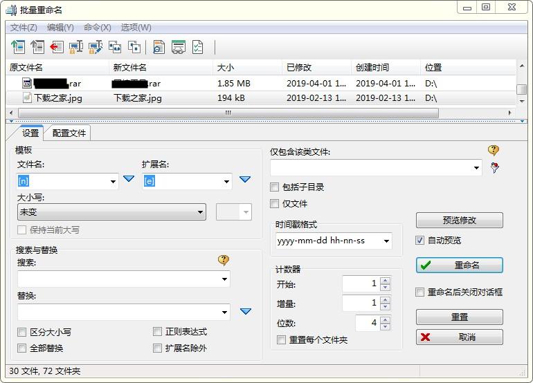 通过主菜单项“文件→多重重命名…”或快捷方式“ Ctrl + M”,将打开“批量重命名”窗口,如下图所示,可以在重命名活动面板中选择的项目(文件和/或文件夹)。