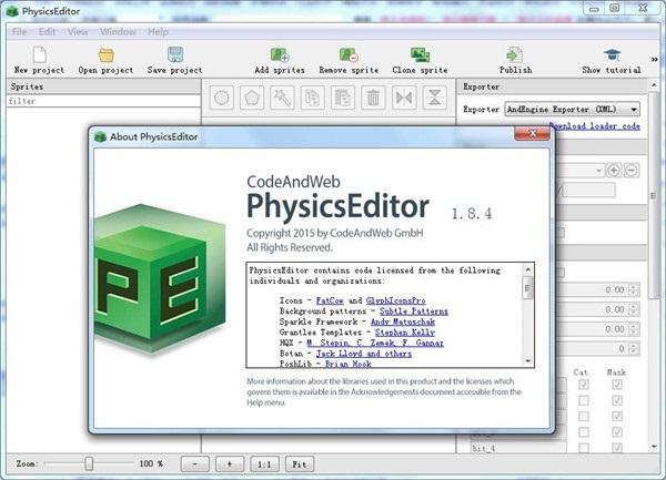 该程序易于使用,因为只需要添加源图片-精灵,使用内置形状跟踪器,配置各种物理参数,选择引擎,导出项目。至于源文件,应用程序可以加载PNG、JPG和BMP格式的任何文件