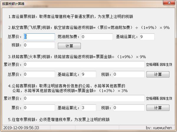 2.航空客票(飞机票)税额:航空旅客运输进项税额= (票价+燃油附加费) = (1+9%) x 9%