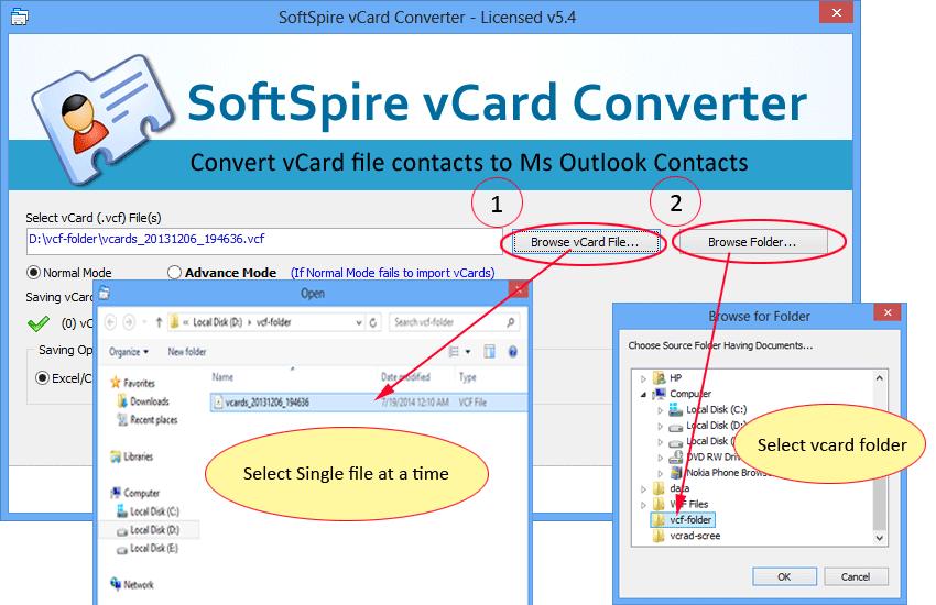 浏览文件夹(多文件转换)–通过“浏览文件夹”选项选择文件夹后,单击“确定”按钮。文件夹名称将出现在“选择vCard(.vcf)文件”部分。