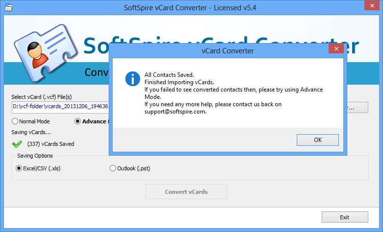 仔细选择所有选项后,只需单击“转换vCards”按钮。软件将要求您选择保存转换文件的位置。选择位置后,软件将开始转换文件。