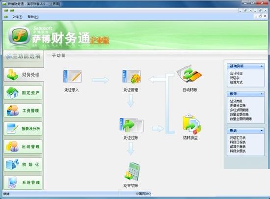 萨博财务通是萨博软件基于.NET技术开发的最新财务管理软件,它秉承了萨博软件易学易用的特点,创新的财务管理理念,高度集成化的管理功能,包含了集成账务、固定资产、工资管理、财务报表、出纳管理、系统等主要模块,完全符合最新的财务、会计和税收制度。