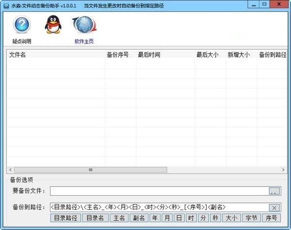 水淼文件动态备份助手最新版备份到路径是可以设置模板的,能够自由引用文件的修改时间(年月时分秒)、目录路径、目录名、主名(文件名前缀),副名(文件名后缀,含小数点)、大小(自动转换字节单位)、字节(原始字节数值)、序号(备份序号,就是已经备份到了第几次)。