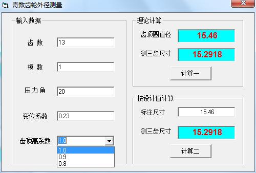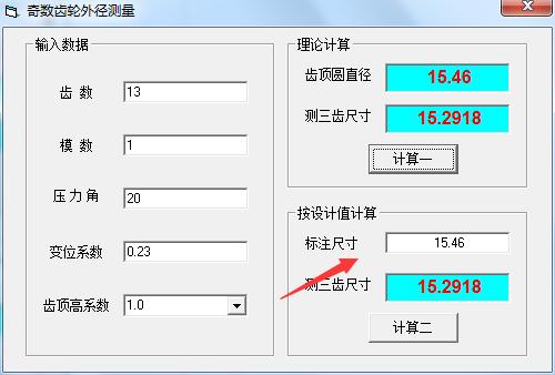 3、提示理论计算,得到的结果是齿顶圆直径15.46、测三齿尺寸15.2918