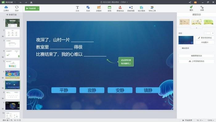 希沃白板免费版是一款专为课堂互动教学开发的软件,能制作出动态交互的课堂展示课件,效果非常棒,特别适合教学中使用。主界面类似于PPT,但是功能主要是集中在交互教学上。软件内置了非常多的各学科插件,比如语文诗词、拼音、数学图像函数、物理实验展示、化学实验、生物、地理星球、在线题库等等。生成式教学,课堂从未如此有趣!为老师设计的互动课件制作工具,简单直观的设计,让老师能轻松地把教学想法以跃然生动的方式呈现,在寓教于乐的环境中演绎知识魅力,实现有趣的互动教学。