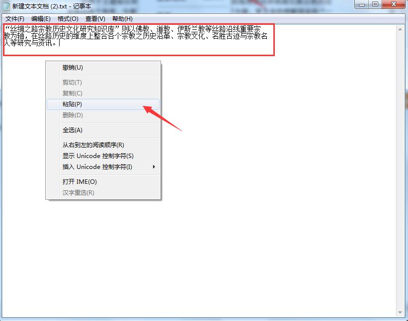 5、打开一个可输入文本的工具,如:记事本。右击选择“粘贴”,这时刚刚选择好的就已经被复制过来了。