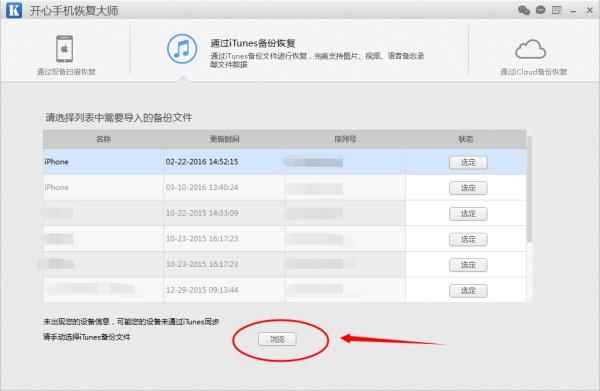 第二步:点击下方的【浏览】按钮。浏览您所保存的备份文件的路径,选择指定的备份文件。(需要注意的是,备份文件需要保存在电脑本地才能被系统进行读取)