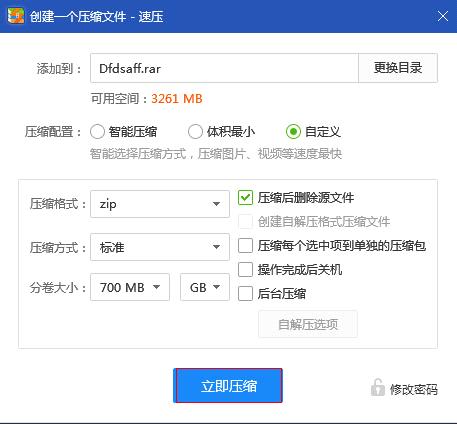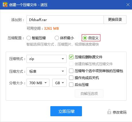 这时候会弹出一个压缩文件的窗口,里面有智能压缩、体积最小、自定义三种压缩配置。选择好压缩选项后,点击立即压缩即可。