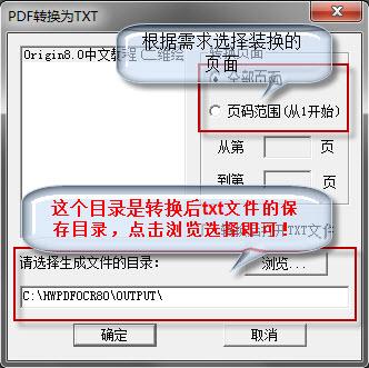 3、选择你需要转换的页面,也就是你pdf文件里边的内容你需要转换的部分,默认是全部转换。选择转换后txt文版的保存地址,点击【浏览】选择文件夹。