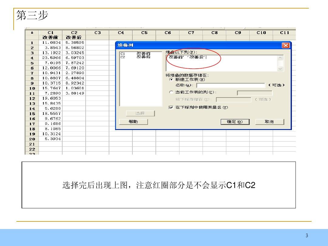 2、进入minitab堆叠列界面后根据作提示后你可以选择需要优先选择的列,改善前或是改善后。
