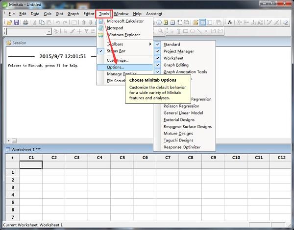 3、如果没正常显示中文模式请选择菜单栏中的【Tool】——【Option】——【General】选择设置成中文模式的选项并重启minitab软件。