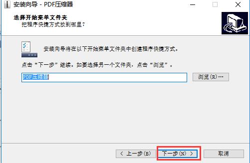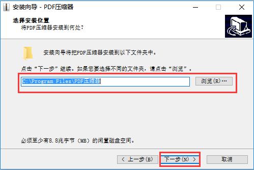 2、为PDF压缩器选择安装位置:程序默认设置是安装在C盘的,为了不影响软件的使用及电脑运行速度小编建议大家单击“浏览”按钮自定义安装路径更好。设置好安装路径后点击下一步继续;