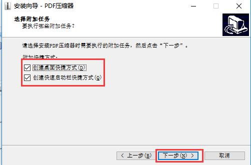 4、接着就会进入到选择附加任务界面,这里有:创建桌面快捷方式及创建快速启动栏快捷方式两个选项,为了方便以后可快速找到并打开PDF压缩器,这里我们选择默认全部勾选。点击下一步继续;