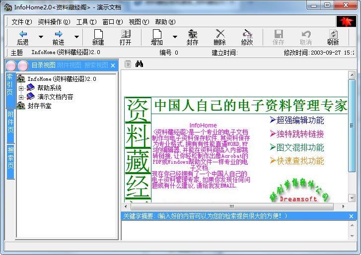 资料藏经阁版是一款可以帮助用户进行资料管理的软件。资料藏经阁最新版像PDF一样专业、像Widdows帮助文件一样相关资料间有链接。可由一个主题跳到相关其它主题,拥有一个很好的编辑器,并能在资料间插入内部跳转链接,让你轻松制作出非常棒的电子文档。资料藏经阁版作简便,易于上手。