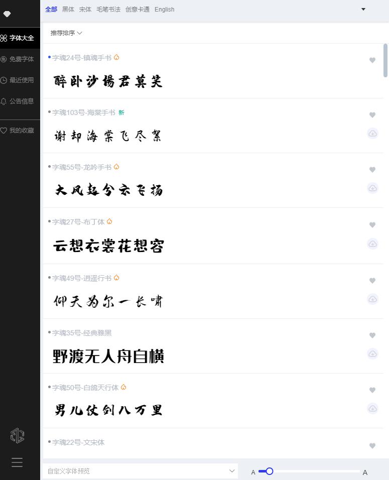 界面简洁,功能强大,点击字体即可快速换字,支持丰富的筛选和智能搜索。