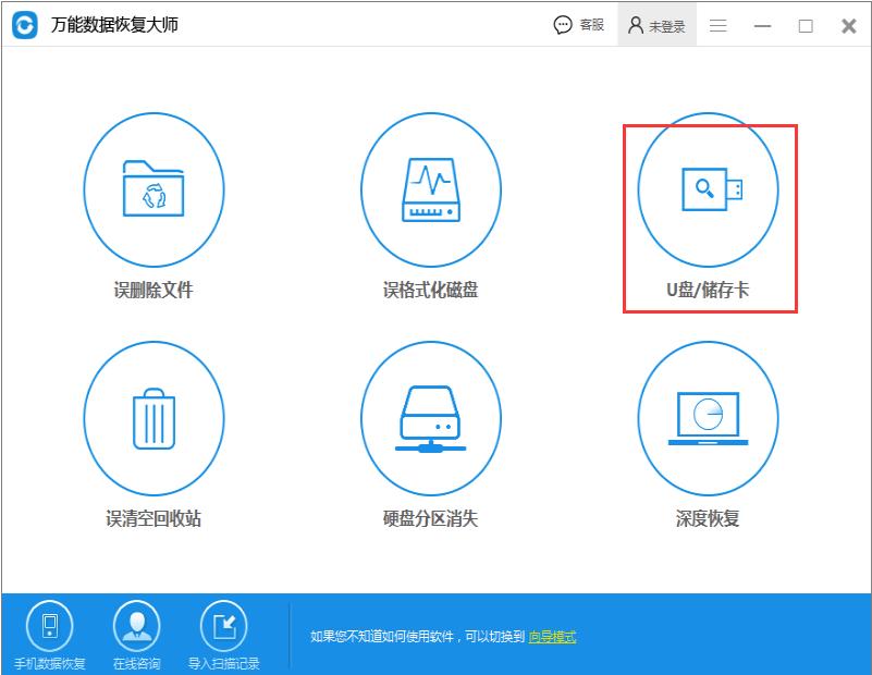 1、打开万能数据恢复软件,单击“U盘/存储卡”再根据提示选择需要恢复文件的U盘。