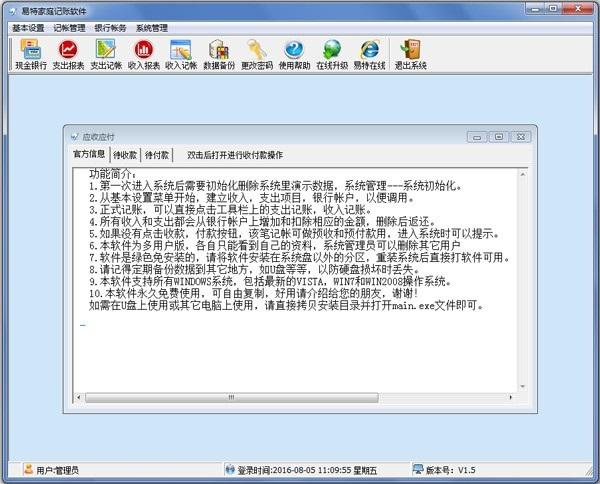 5.如果没有点击收款,付款按钮,该笔记帐可做预收和预付款用,进入系统时可以提示。