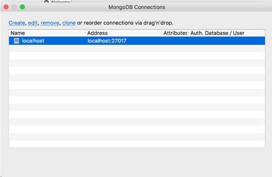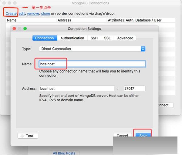 1、下载安装成功后,打开后点击左上角的 创建一个连接,给该连接起个名字,如:localhost, 使用默认地址 localhost 和 端口27017 即可,点击save保存。