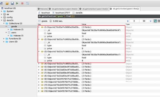 3、双击 localhost 连接到 MongoDB 并进入交互界面,我们可以看到我们本地数据库的表如下:
