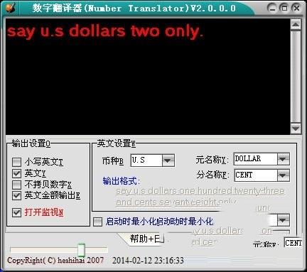网络上有很多在线数字翻译器,方便实用,今天我们给大家介绍的是一款单机数字翻译器,数字翻译器主要目的在于方便需要做英文fapiao的朋友以及从事会计出纳的人员,本软件只根据公司商务英语惯用方式自动生成英文金额。中文金额根据现行会计金额规则自动翻译。