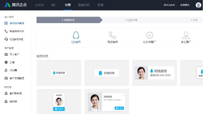 3、根据不同接待渠道,选择投放的不同样式。如QQ接待组件可投放到网页,QQ公众号图文,H5及生成二维码/超链等。