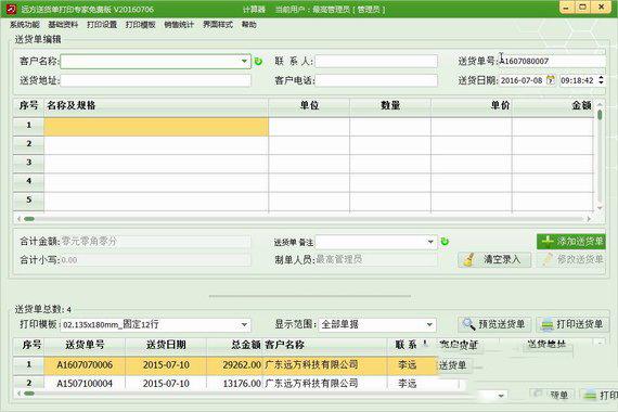 远方送货单打印软件集送货单管理,产品管理,客户管理,数据统计分析,图表分析为一体。送货单号由系统自动生成(可按年+月++流水号)单号规则自己定义真正的方便实用。充分利用强大的数据库功能给工作带来的便利,配合强大的权限管理,真正的让您从此告别手写送货单和Excel做月结的烦恼,打印出整齐漂亮的送货单。